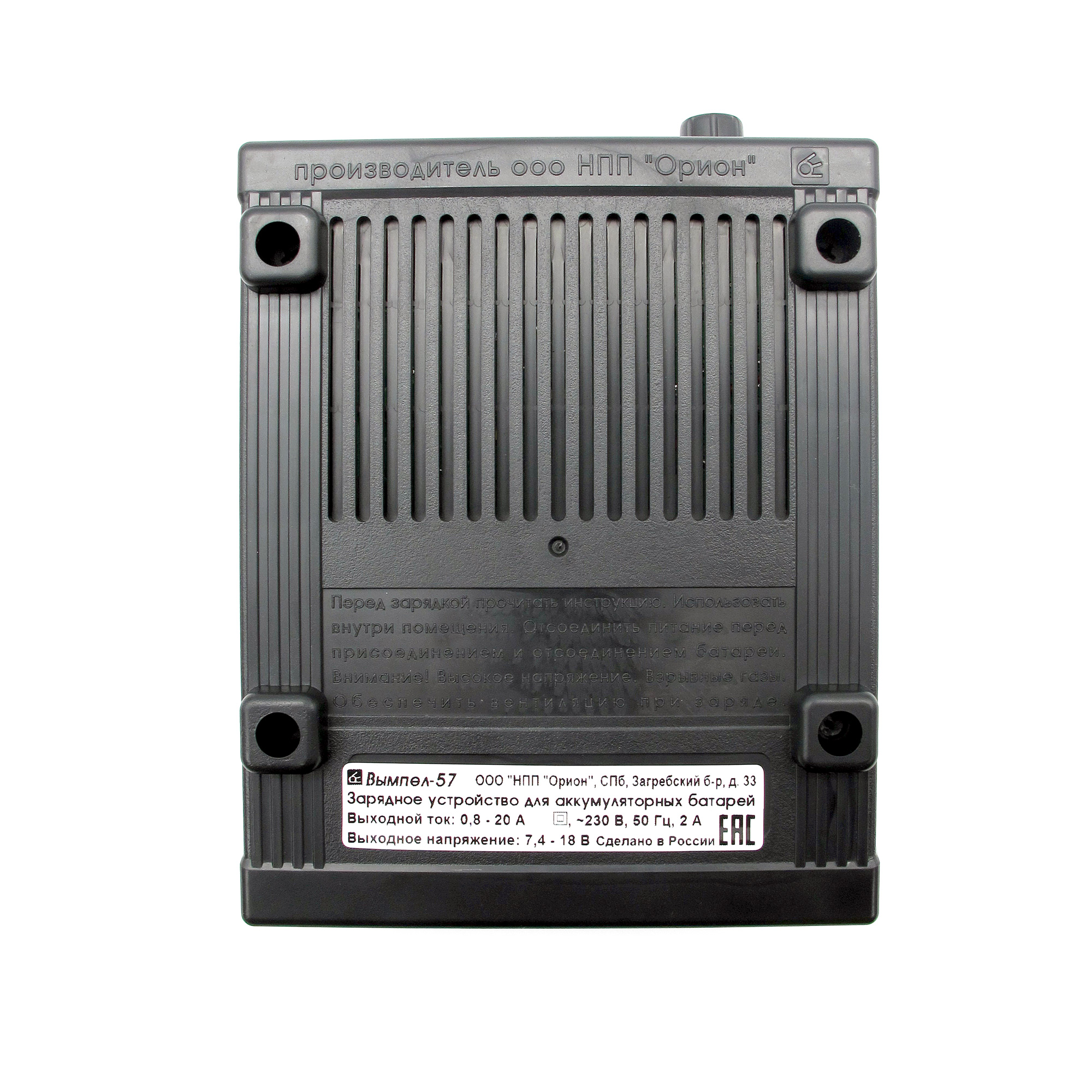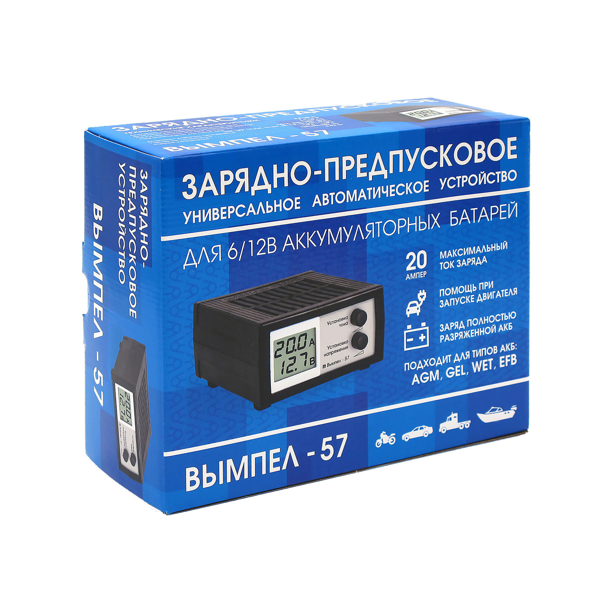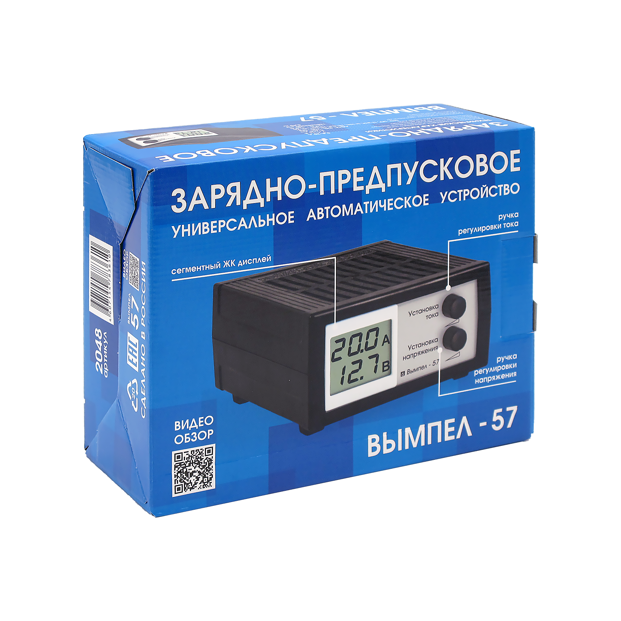 Зарядно-предпусковое устройство Вымпел-57 осуществляет заряд стартерных (автомобильных и мото АКБ), тяговых (лодочных АКБ) и прочих аккумуляторных батарей с различной емкостью. Как в полностью автоматическом, так и в неавтоматическом режиме. Электронная защита от короткого замыкания, перегрева, переполюсовки. Заряд полностью разряженного аккумулятора. Диапазон рабочих температур от -10 С до +40 С.